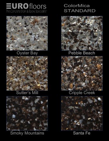 EUROfloors carries 9 standard color blends (see color charts), but architects and designers love using the Virtual MicaFlakes blend tool: https://www.torginol.com/mica/