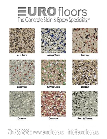 EUROfloors carries 9 standard color blends (see color charts), but architects and designers love using the Virtual Vinyl Chips blend tool: http://www.colorflakes.com/tool/